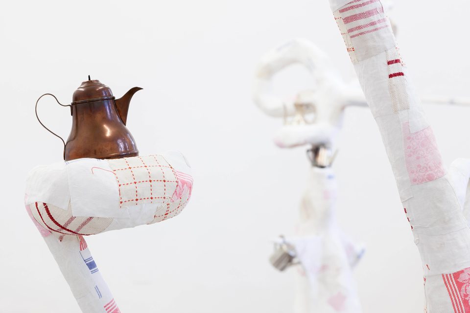 Albin Bergström überzeugte die Jury mit seinen gewagten und fröhlichen Skulpturen, die von formalem wie inhaltlichem Einfalls-reichtum zeugen. In ihre Oberflächen eingearbeitete gefundene Textilien und die Teekannen aus aller Welt und in allen Formen, die in ihnen hängen und auf ihnen abgestellt sind, machen die Skulpturen zu extravaganten, aber stummen Protagonist*innen, in deren körperlichen Einschreibungen sich auf subtile Weise die Neutralisierung von Geschichten kolonialer Ausbeutung in alltäglichen (und scheinbar unschuldigen) Ritualen widerspiegelt.