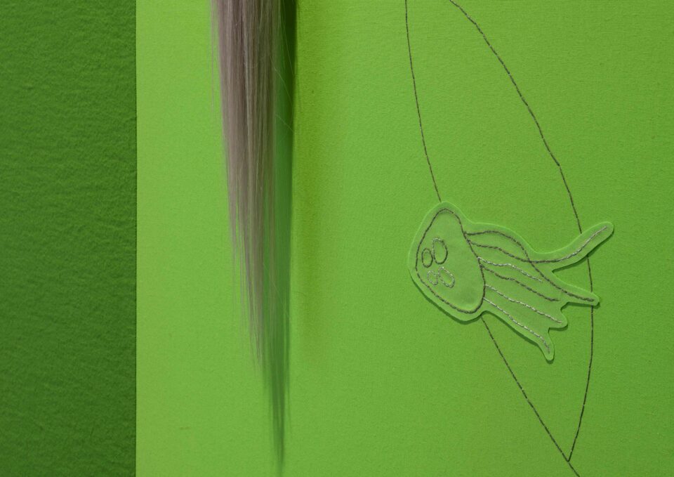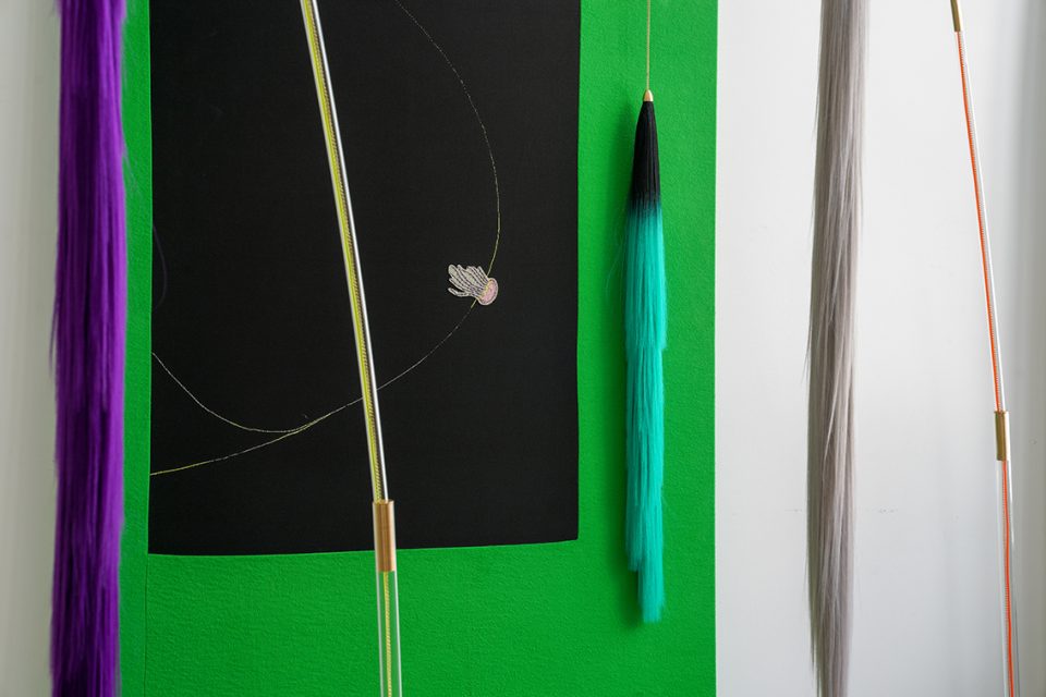 Diese künstlerische Darbietungen funktionieren wie Fäden, die ihre Geschichten, Bühnen und Charaktere miteinander verbinden. In ihren textilen Arbeiten sind die Fäden minimal, aber deutlich sichtbar, ähnlich wie das Kneifen, das man braucht, um aus einem Traum aufzuwachen. Verknüpfen, Umkreisen und Umherstreifen sind Strategien, mit denen die Ausstellung BURN & GLOOM! GLOW & MOON! in Bewegung gerät und neue Verbindungen zwischen Daschners Arbeiten herstellt. Als Reaktion auf ihre traumartigen Szenerien werden einzelne kraftvolle Elemente aus Filmen und Performances selbst zu eindrücklichen Installationen und berühren sich auf neuartige Weise.