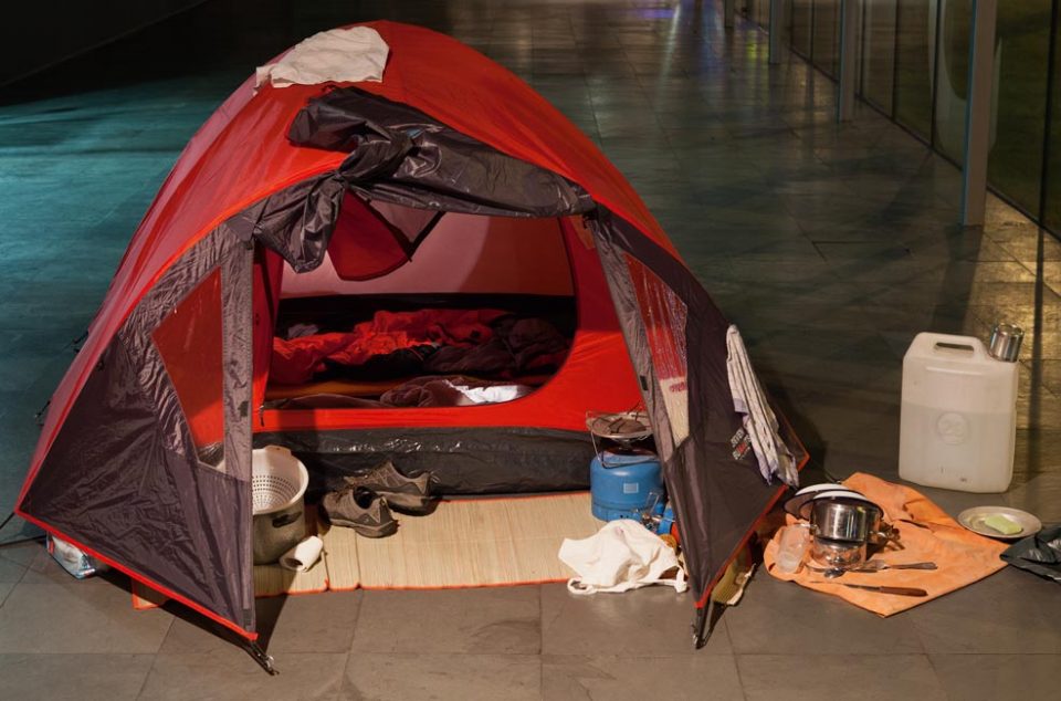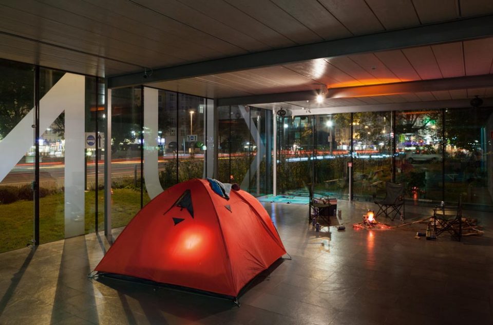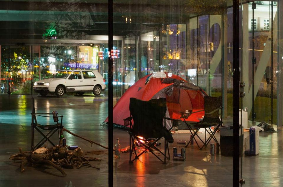 Ein menschenleeres Camping-Setting hier, ein Auto im Leerlauf ohne Insassen dort, dazwischen nichts als Raum – ist da niemand? Was ist geschehen? Und warum?