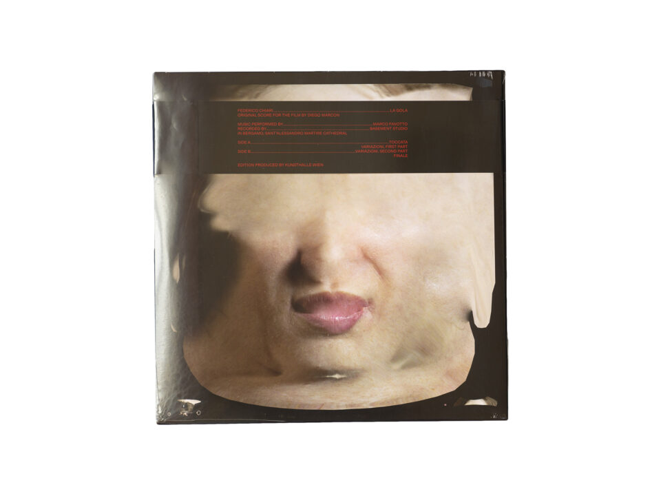 This artist edition is a record of the newly commissioned film score of Diego Marcon’s film La Gola (2024). Composed by Frederico Chiari, it was recorded on an organ at the seventeenth-century Cattedrale di Sant’Alessandro Martire in Bergamo. The record sleeve shows renderings of the two film protagonists – hyper-realistic mannequins animated with CGI technology.