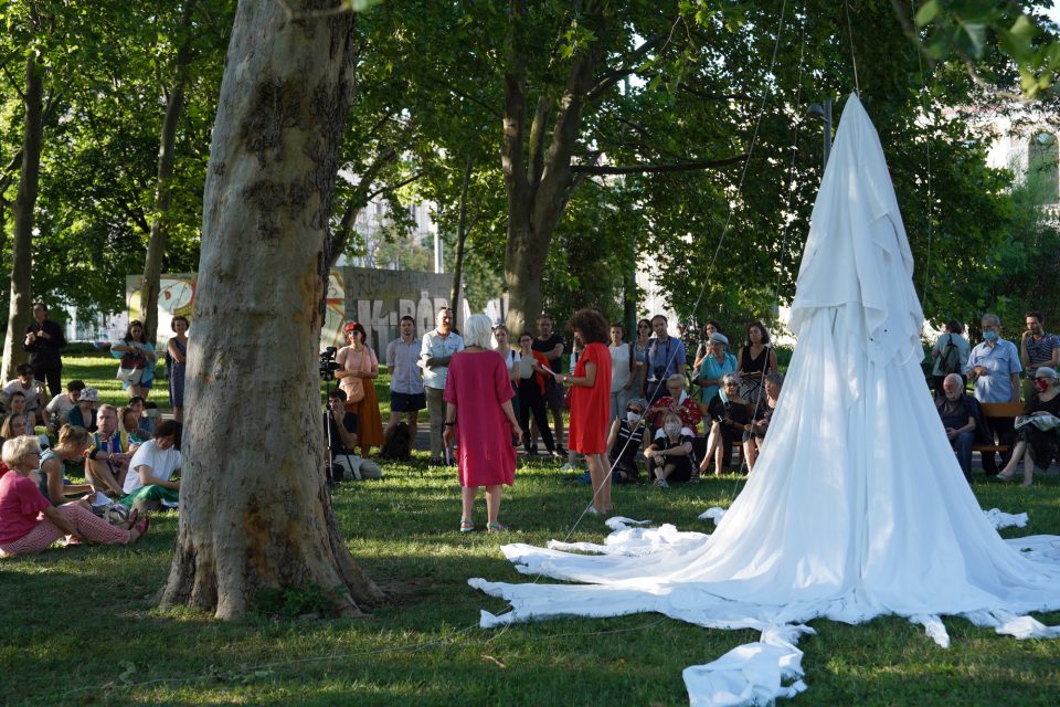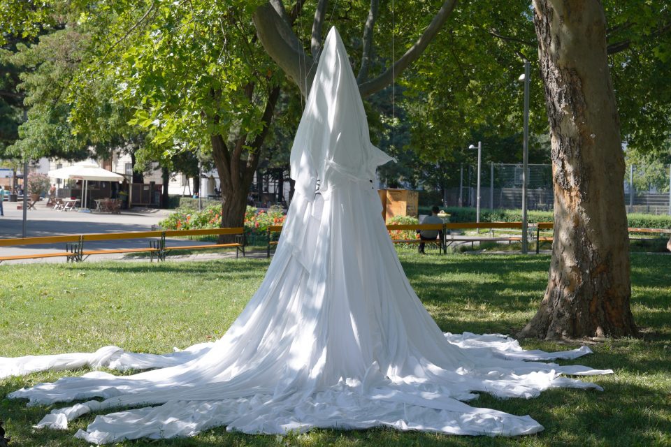 For KISS, Margot Pilz restages her Hausfrauendenkmal (Monument to Housewives) from 1979, originally presented as a sculpture-action in Graz. The work makes the domestic public, the personal political, and the invisible obvious. Made of several layers of white linen bedclothes that are overlapped, patched together, and fixed around a wooden pole, which is partly held up by a string tied to a tree, the installation looks like a giant fabric cloak enveloping … a void. The used bedsheets represent the entirety of life, from reproduction and care activities to rituals that all humans perform (birth, love, sleep, death). At the same time, they symbolize the reality faced by housewives, the gendered division of labor, and the misrecognition of domestic work.