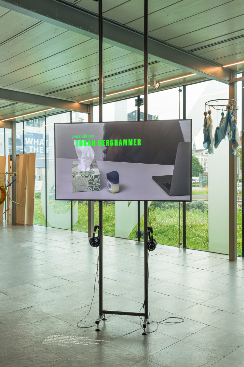 Luisa Berghammer uses the institutional platform to address collective working processes; in this case, the complex collaborations involved in making the exhibited film – people would call you a faker and it hurt your feelings – and how an artist can best recognize them. The video confronts the viewer with a dizzying list of names as a broader observation by Quirin Babl, Luisa and Zorah Berghammer, and Luīze Nežberte on hypervisibility versus a lack of recognition, and the position of the artist (and their ego) in this context. Different kinds of labor, such as the intellectual and emotional, are credited equally alongside the physical and technical to question established modes of image production and how a group can best address their positions in this process. This idea becomes particularly provocative when considered within the context of Come as You Are, as a prize exhibition founded on the idea that certain graduating artists should be rewarded over others.