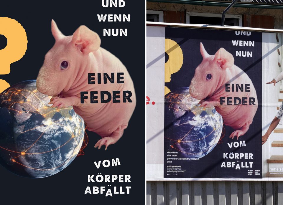 The work of the Russian collective Chto Delat draws on the aesthetics of Soviet anti-nuclear war posters from the 1970s, which mixed cutout images to create threatening scenarios of environmental devastation. The question in Chto Delat’s graphic work, “What will happen if one feather falls from its body?,” is a playful revision of the exhibition’s title, inviting us to see the origins of the coronavirus pandemic in terms of the black swan theory—which describes unpredictable and unexpected events that can trigger severe consequences. In the work’s speculative fiction, an interconnected and globalized world is pushed around like a toy by a skinny pig, a breed of guinea pig developed in 1978 by scientists.