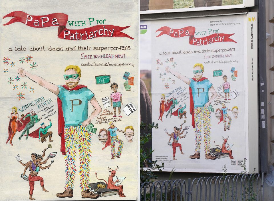 This work by the anticolonial artist and activist Daniela Ortiz is an ad for a hand-drawn children’s book about a father who is a hero—but a hero of the patriarchy. The image introduces the different characters of a story that explores the legal mechanisms behind racist and patriarchal abuse and violence. Ortiz addresses how psychological oppression and its forms of economic, mental, physical, and emotional confinement, particularly as experienced by single mothers while parenting, is close to the social quarantine being enforced due to the COVID-19 pandemic. The book is available for free download at kunsthallewien.at/en/papapatriarchy.