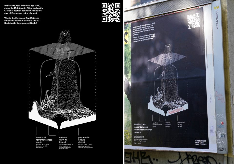 Inhabitants is an online channel for exploratory videos and documentaries about issues related to environmentalism and the Anthropocene, founded by Portuguese artists Pedro Neves Marques and Mariana Silva in 2005. This graphic work is part of its research into the deep-sea mining industry, which has turned oceans into the latest frontier of corporative mineral extraction. The graphic draws attention to current explorations that are part of development plans for new undersea mines that will cover an area the size of Europe. The destruction of the ocean floor threatens not only marine life and ecosystems but the entire global fight against environmental injustice and the climate emergency.