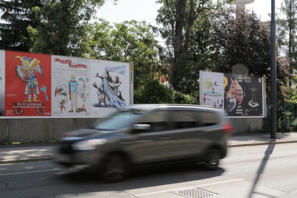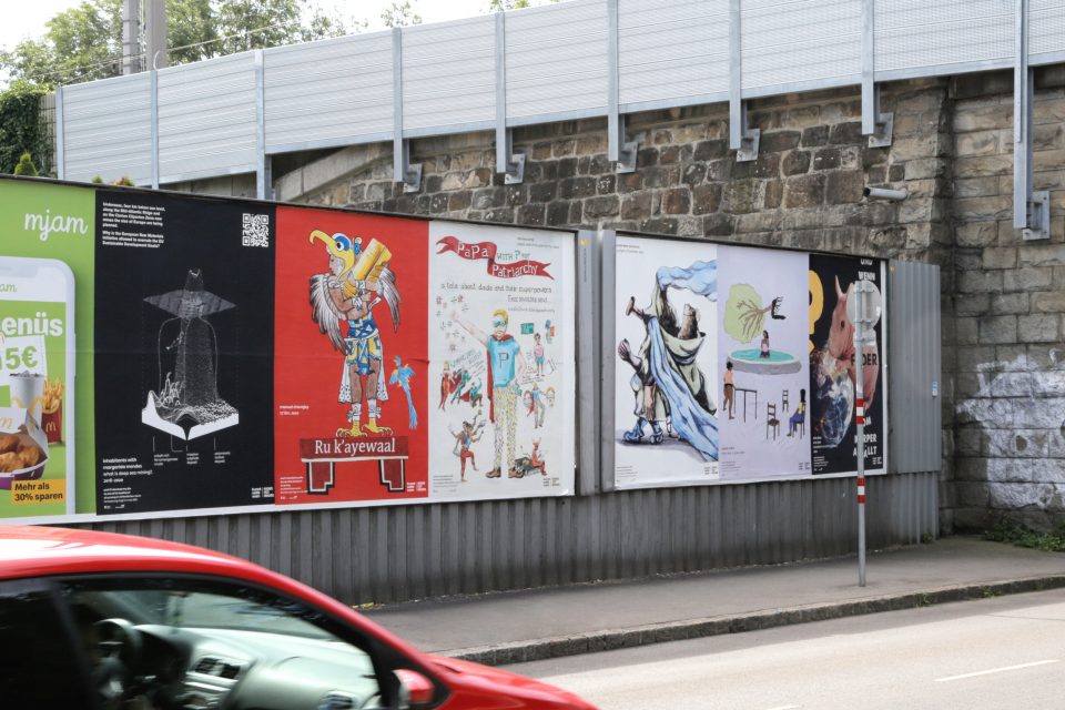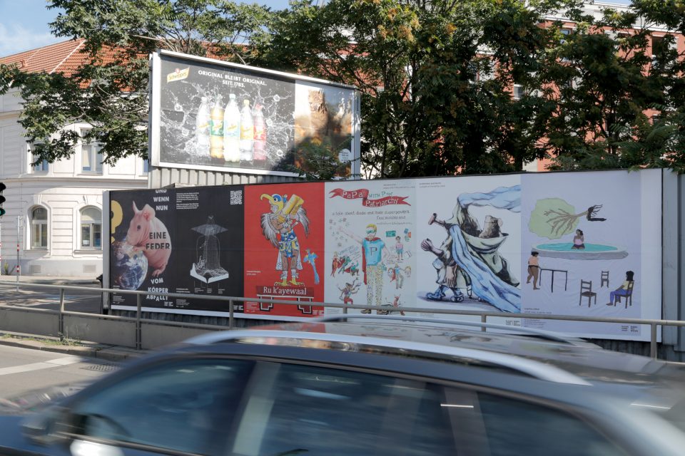 For now, we invite you to a prologue to the exhibition: a selection of works designed for public settings. Starting June 1, 2020, works by six artists and artist collectives—Manuel Chavajay, Chto Delat, Inhabitants with Margarida Mendes, Daniela Ortiz, Prabhakar Pachpute, and Sophie Utikal—created specifically for this occasion, will be featured on 250 billboards throughout Vienna.