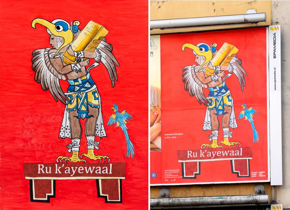 Maya Tz’utujil artist Manuel Chavajay depicts Tz’ikin, one of the twenty nahuales of the Mesoamerican cosmology, which are animal spirit counterparts of the humans for whom they function as protectors. The character carries a gold ingot, representing how the Traditional Territories of the Maya are seen by the West as a place for the accumulation of capital based on extractive logics, through the exploitation of people and natural resources. The Tz’utujil word “Ru k’ayewaal,” which appears at the bottom of the work, can be translated as “being in trouble because of an imposed, violent situation.”