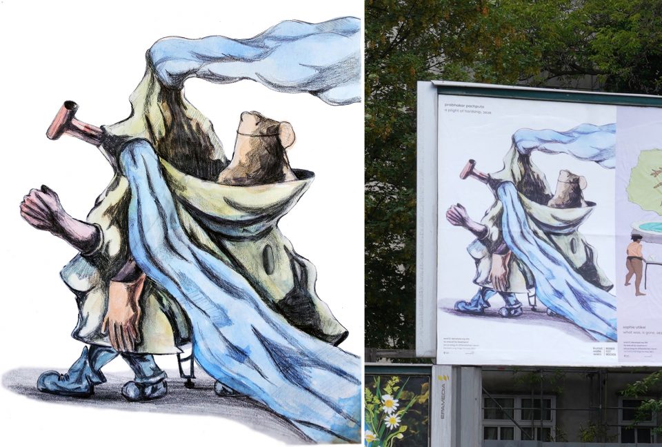 Prabhakar Pachpute’s drawing depicts a character midstride who is made up of body parts, personal belongings, and cleaning accessories, evoking the iconographic forms of some Indian goddesses of epidemic diseases. Here the artist addresses the flipside of the global slowdown of everyday activities and nationwide lockdowns: lowest-paid essential workers who keep things moving during the pandemic and often lack access to benefits like paid leave and health insurance. The character’s movement also may refer to migrants who have nowhere else to go, or perhaps to the current mass exoduses from densely populated cities to rural areas. Underneath the various layers worn by the walking figure, a violent absence of justice and labor rights is revealed.