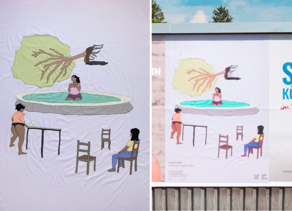 Sophie Utikal’s textile piece explores the sensations of belonging and displacement in the encounter with an unknown future. The interruption of everyday life emerges in her work as an atmosphere of constant and conflict-ridden negotiation with passivity. The arrangement of the characters evokes the forced physical distancing and the disruption of the tactile currently being imposed on interpersonal relations, addressing the effects that the pandemic has had on our emotions, feelings, and behaviors.
