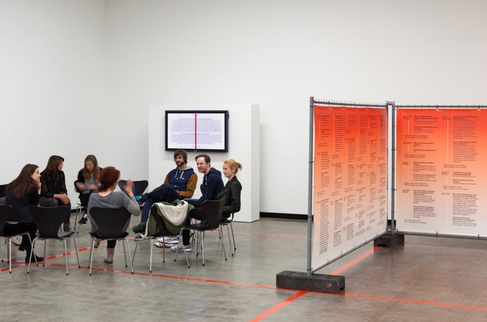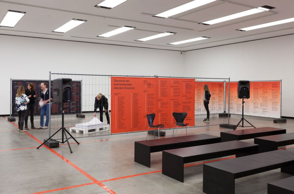 An exhibition display presents the interviews, embeds the texts in a graphic system and opens up different routes through the exhibition. Attention Economy is accompanied by a diverse program of events with theme evenings, filmscreenings and discussions with artists.