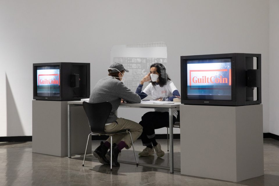 During the exhibition Cybernetics of the Poor, Coleman Collins’s installation will be activated every Thursday from 3 to 7 pm and on Sat 6/3 and 13/3 from 2 to 6 pm through the sale of Guilt Coin in the booth he has put in place. This coin has been derived from the ultra-cybernetic Bitcoin currency and inspired by the word Schuld which in German means both “guilt” and “debt”. Therefore, this currency plays with notions of moral and ethical control and the limits of value.