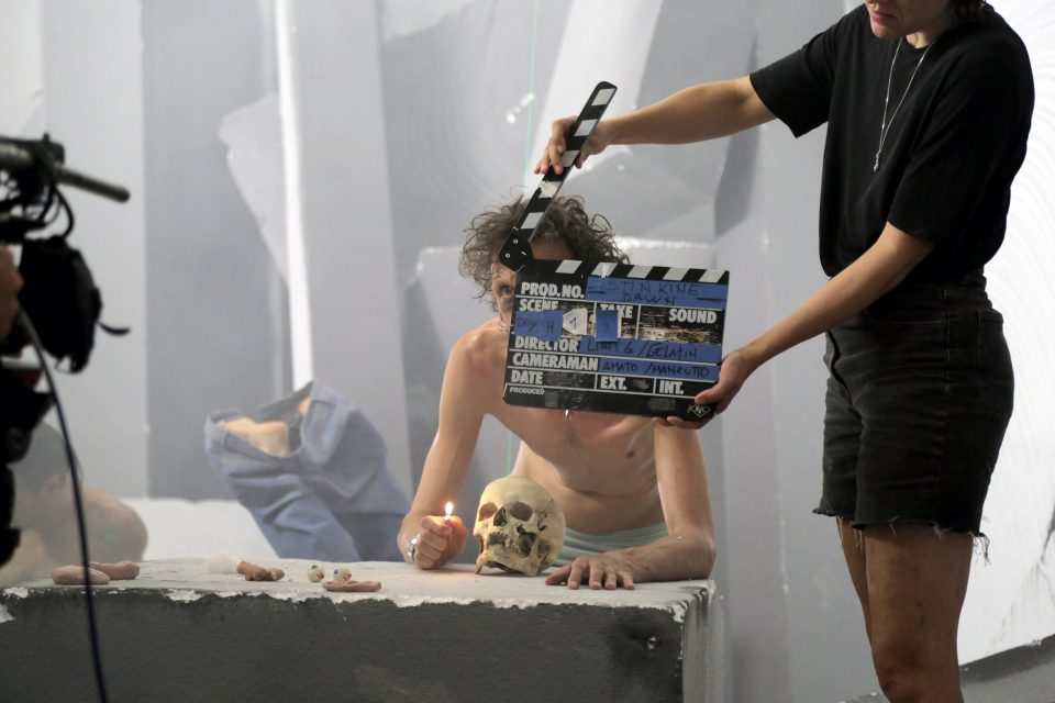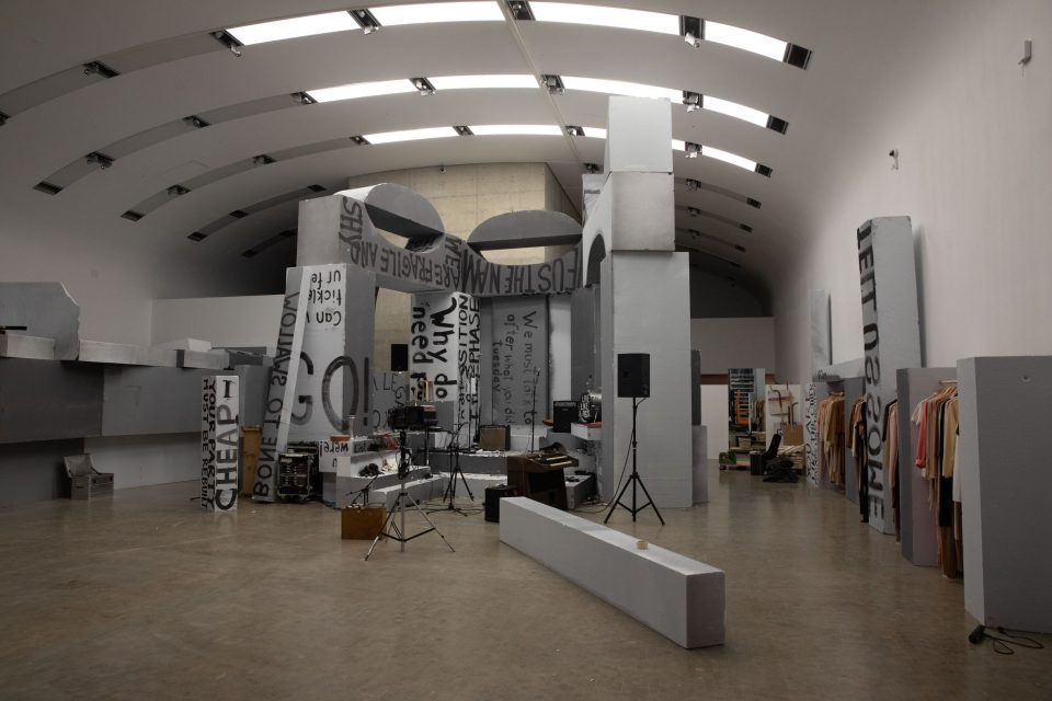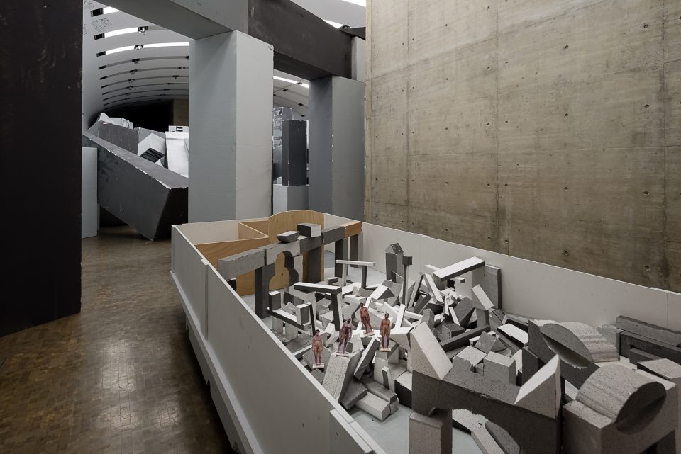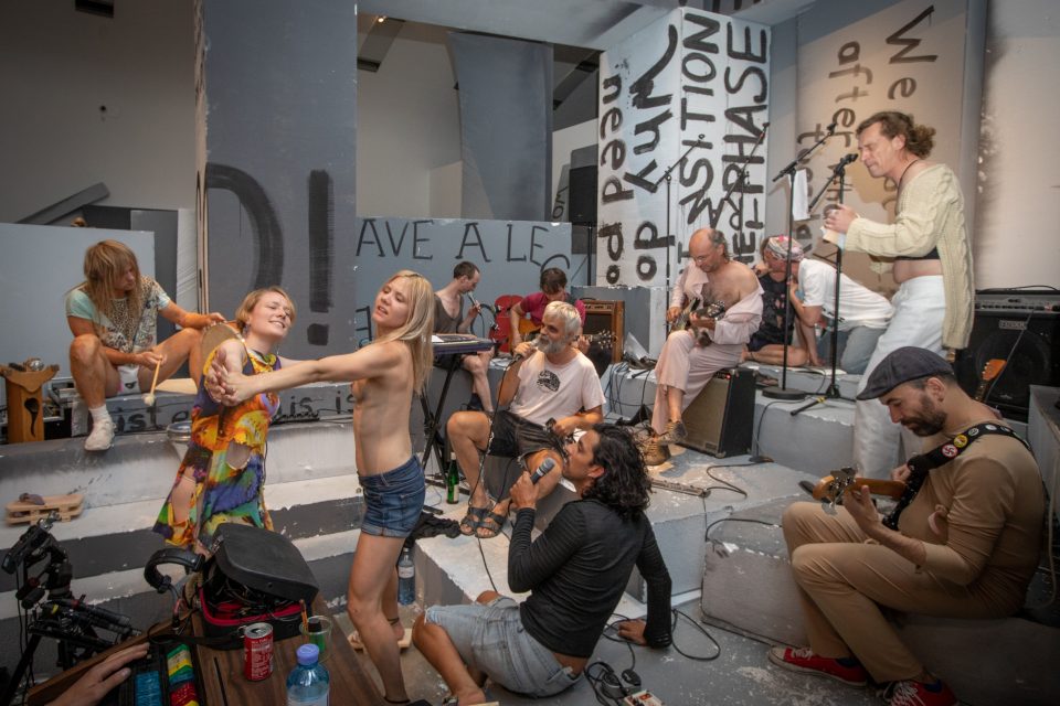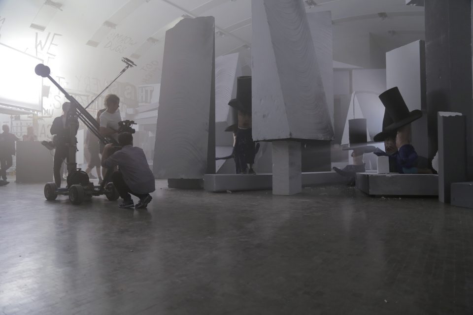 During the shooting period (July 4–13), the artists were joined by many artist friends and long term collaborators. All visitors to the exhibition were potential extras inside a sprawling modifiable stage setting—a faux-stone toy-block architecture of colonnades, amphitheaters, night-club interiors, and a prison. After the film shoot, the postproduction begins. The exhibition for the remaining duration shows the looming grey and graffitied remnants of the production. A large slideshow of photographs is projected within the monumental setting providing insights on the filming process. Musical instruments in the space haphazardly play while visitors are able to walk among the tattered sculptural traces of the scenery that gave the film its peculiarly striking mise-en-scène.