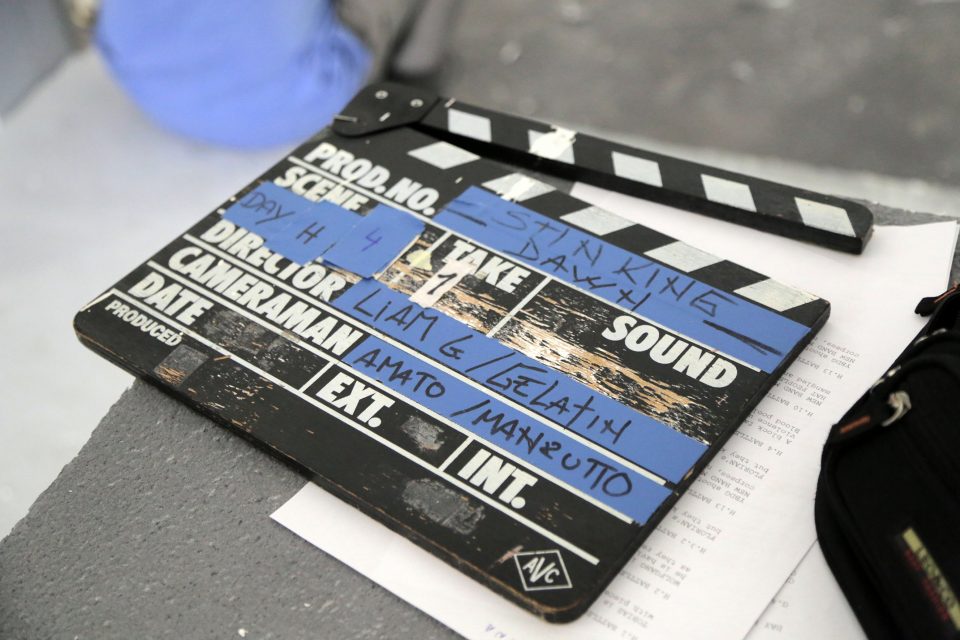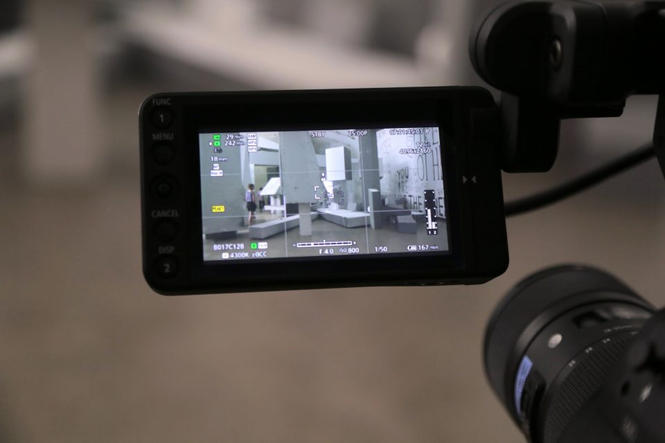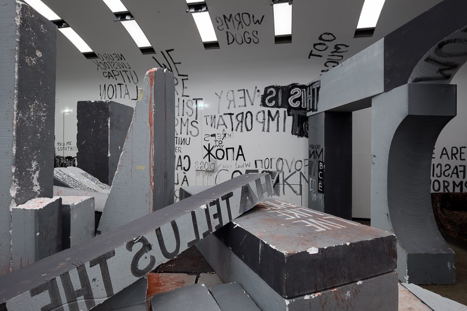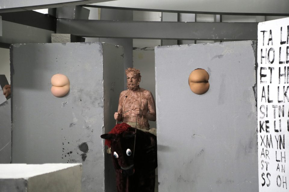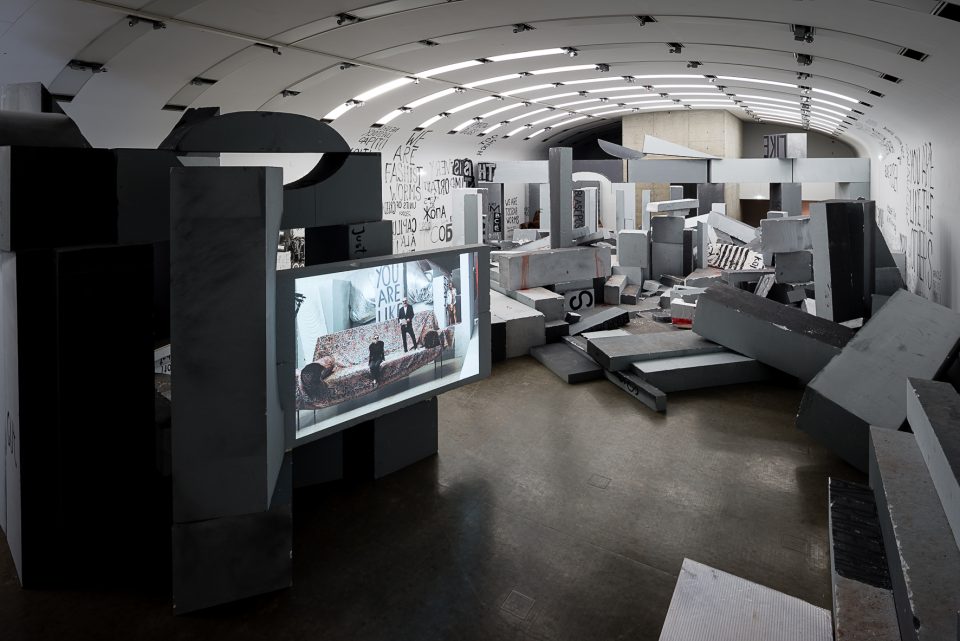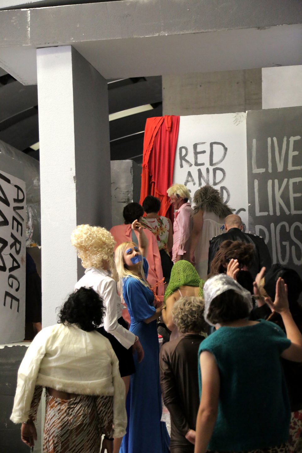 During the shooting period (July 4–13), the artists were joined by many artist friends and long term collaborators. All visitors to the exhibition were potential extras inside a sprawling modifiable stage setting—a faux-stone toy-block architecture of colonnades, amphitheaters, night-club interiors, and a prison. After the film shoot, the postproduction begins. The exhibition for the remaining duration shows the looming grey and graffitied remnants of the production. A large slideshow of photographs is projected within the monumental setting providing insights on the filming process. Musical instruments in the space haphazardly play while visitors are able to walk among the tattered sculptural traces of the scenery that gave the film its peculiarly striking mise-en-scène.