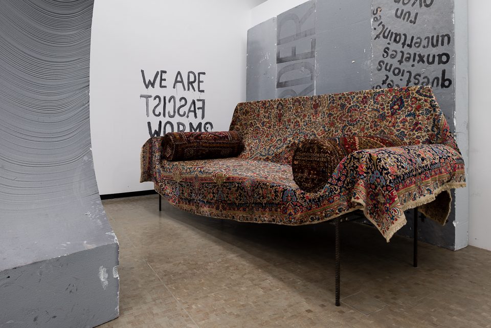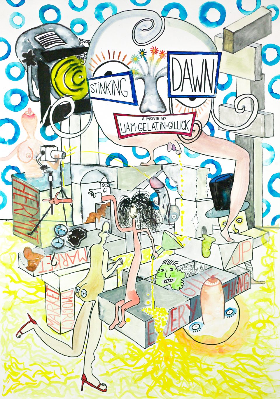 Stinking Dawn is an exhibition in the form of a production process for a full-length feature film by Gelatin and Liam Gillick. The collaboratively developed and improvised experimental film will examine the limits of human tolerance in the face of oppression, political crisis and excessive self-delusion. It follows the destiny of four privileged young people who grow up at a time of crisis and move through various stages of development and self-reflection towards a final moment of collapse.