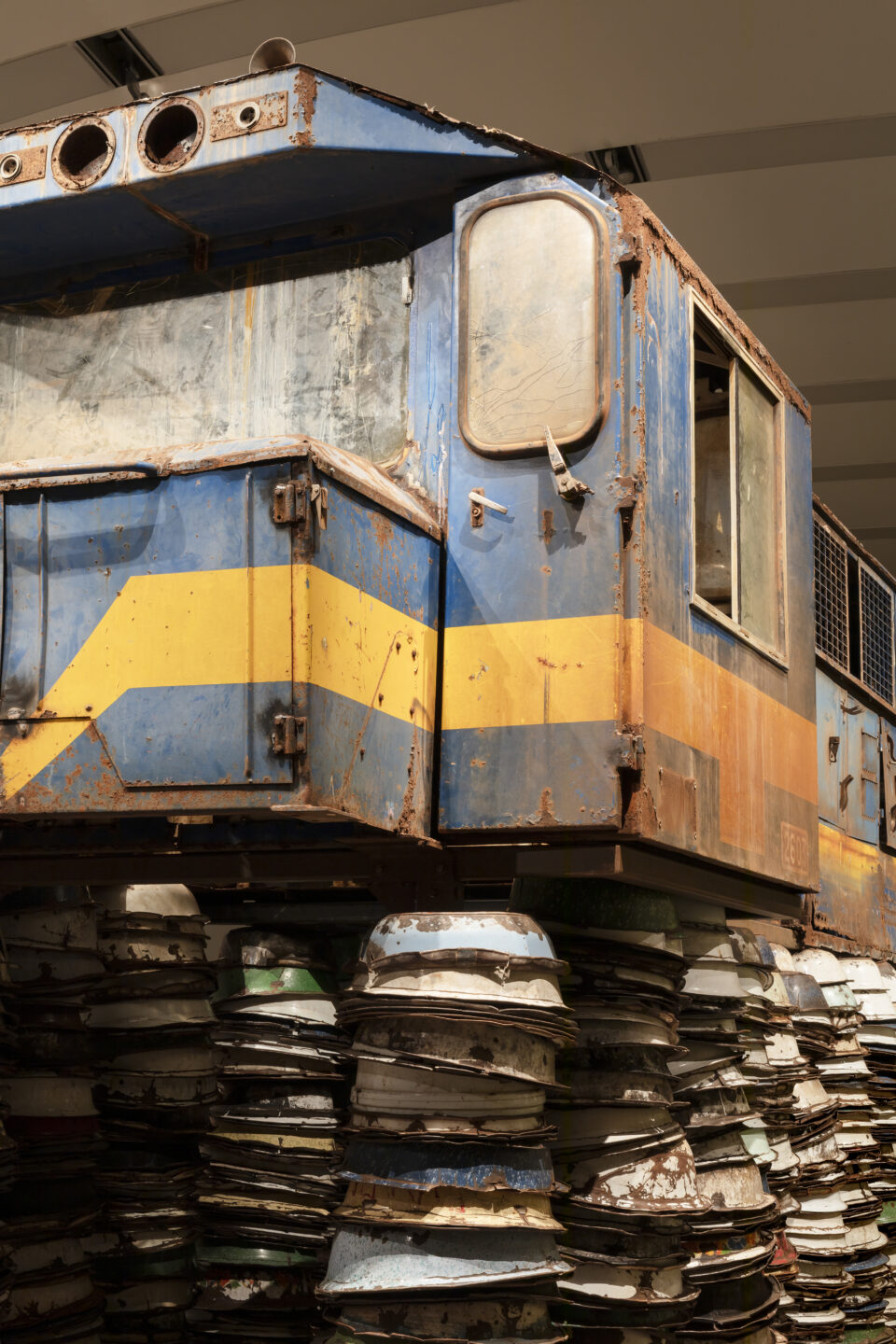 The pans are a commonplace vessel used in Ghana to carry goods and materials. Mahama amassed a collection of thousands of used pans, exchanging new for old. Chipped, rusted, dented and torn, the objects evidence heavy use. Stacked underneath the train, they bear a locomotive that can be seen as another kind of vessel.