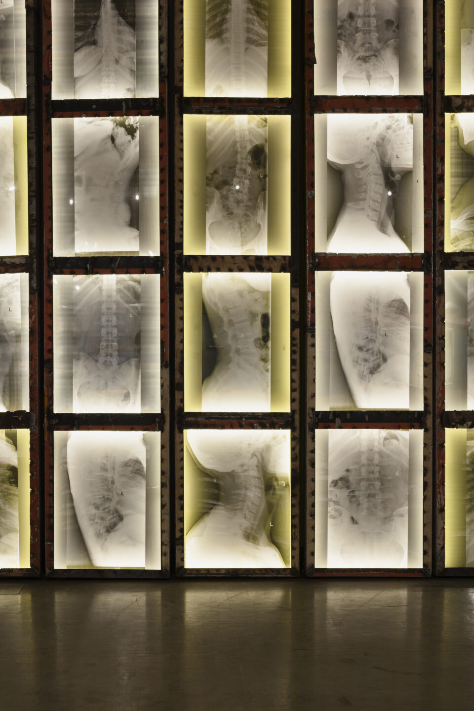 An accompanying series of photographic works consider the damage inflicted upon the human body by the daily activity of carrying the headpans. These include over 100 X-ray images of spinal deformation that are framed within a metal scaffold removed from the train. At once a symbol of and a system for colonial and capitalist extraction, Mahama’s critique figures the railway as an infrastructure that was literally built on the backs of Ghanaian people.