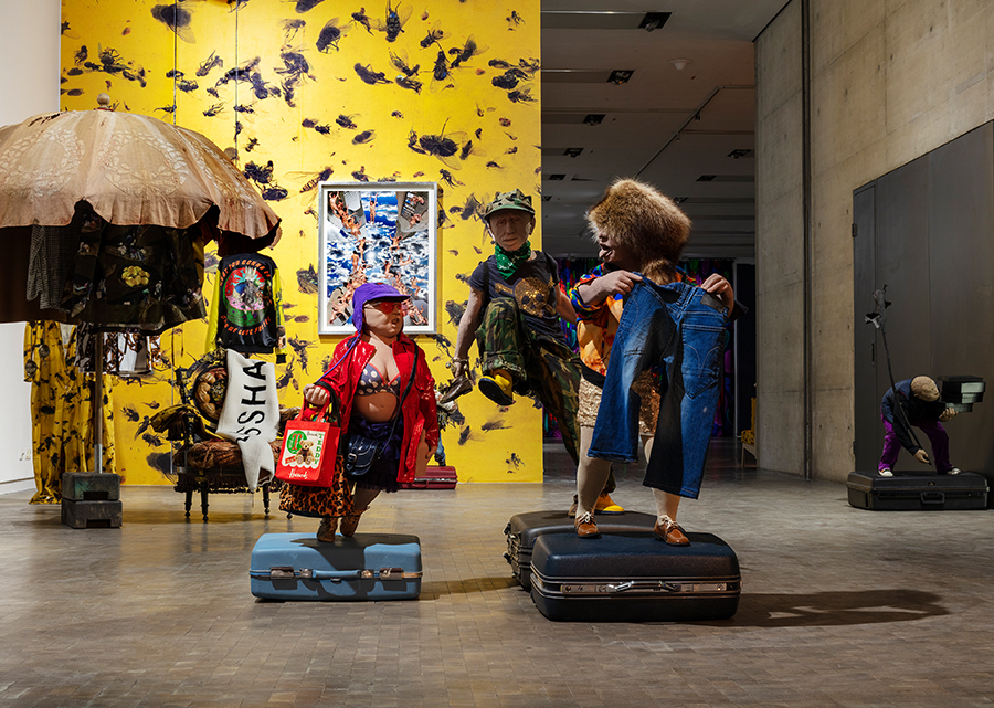 This exhibition is both a continuation and a newly visualized manifestation of her work as an artist as well as an archivist, a researcher, and collector. In Geistervölker, the artist combines both new and old projects to create a constellation of works that conceptualize the constant and absurd movement between accumulation of capital and the impossibility to continue extracting from the Earth because it has reached the limit of what we greedily and continuously take. The textiles, videos, papier-mâché sculptures and installations on display form a narrative linking global chains of economic production, consumption, and exploitations and the present pandemics, as well as the recurrent patterns that cause and spread pandemics historically.