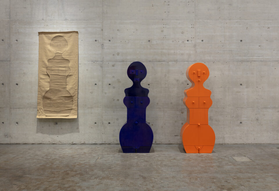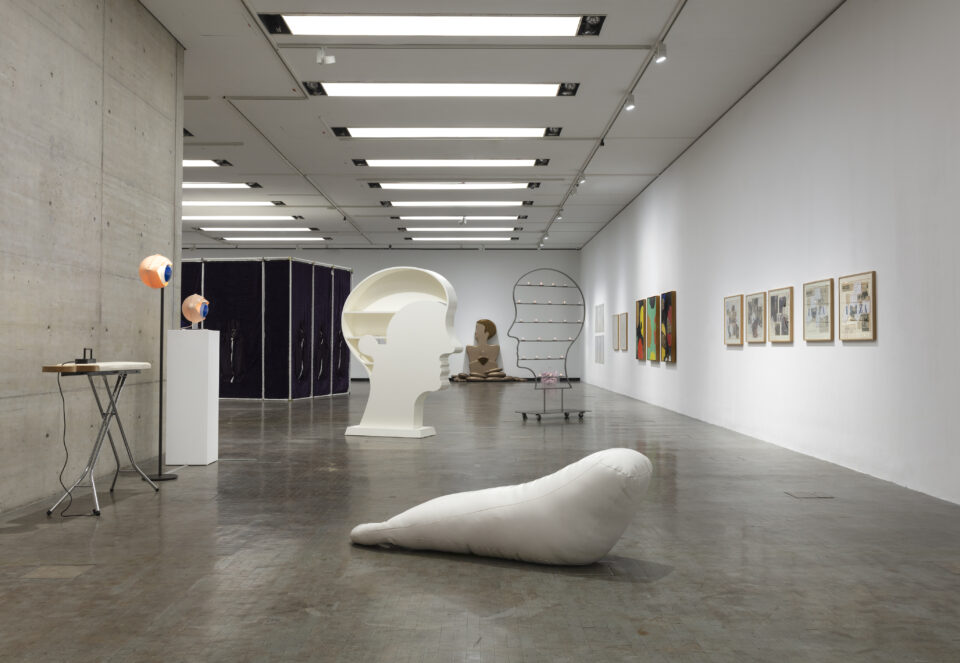 A number of functional objects such as lamps, sofas and commodes are also included. A series of painted wooden cabinets take the form of a silhouetted female torso. Floor and wall-based lamps take the shape of an eye; a coffee table describes the outline of a woman’s body and a sofa is shaped like a head seen in profile. Soft, pliable sculpture takes the form of feet and fragmented bodies. Scaled up and upholstered with coloured vinyl and fur, these tactile objects are imbued with a political message that emphasises equality, collectivity and the place of women within the home and society.