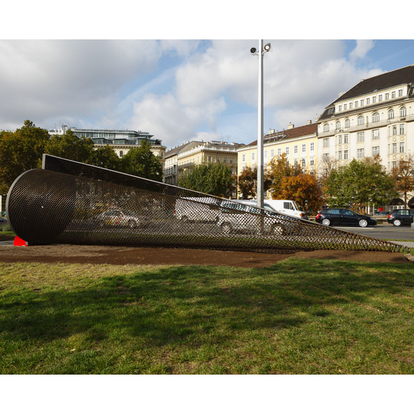 The temporary variation of his architectural constructions Not Vital designed for Vienna is a 10-meter-high conical sculpture called Sleeping House, which, like a living being, rises in the morning and retires to rest in the evening day after day. The Sleeping House, which plays with Vital?s penchant for oscillating between reality and surreality, may be accessed in its ?waking phases? during the day.
