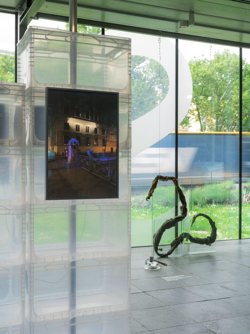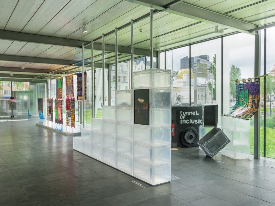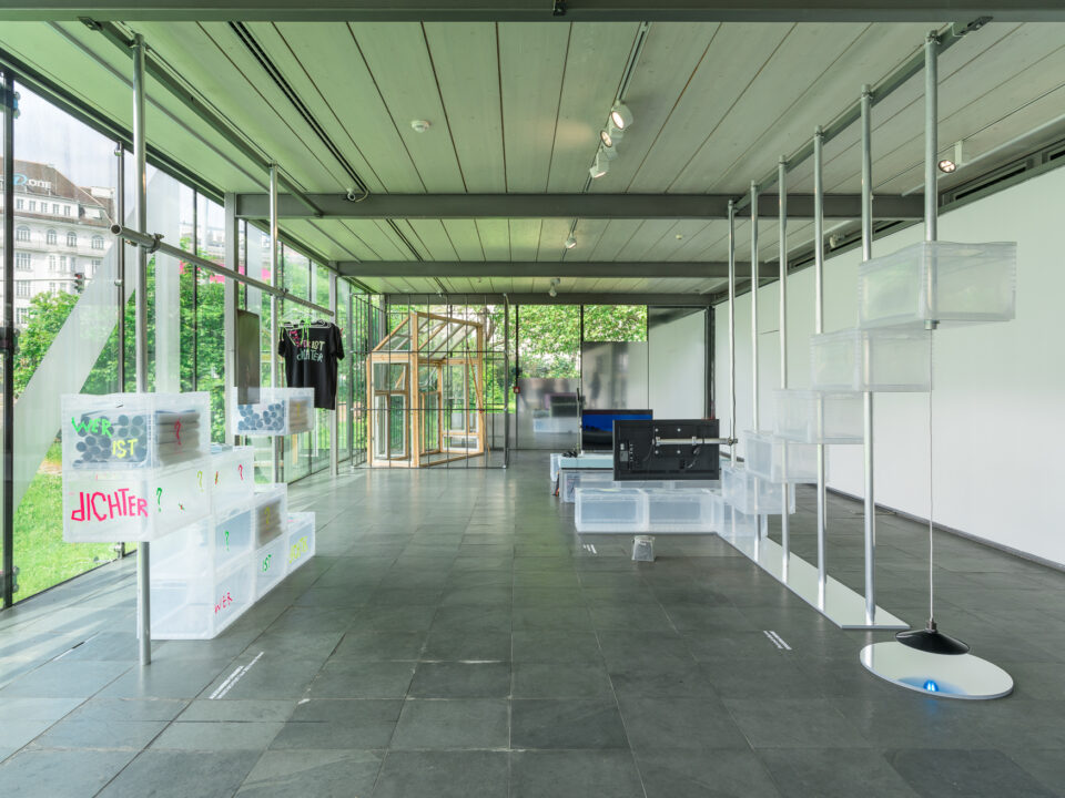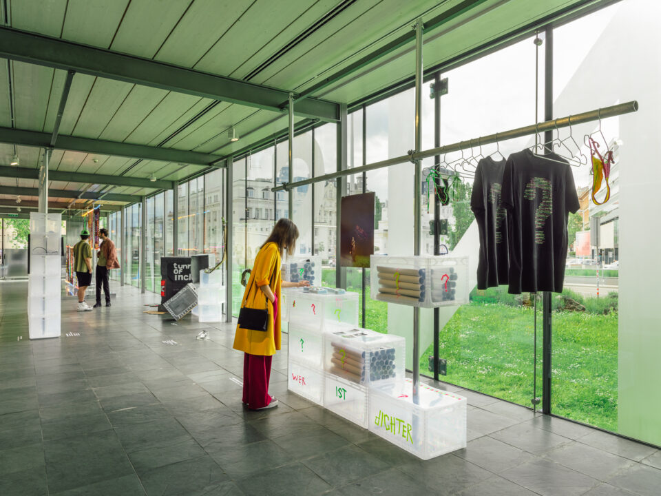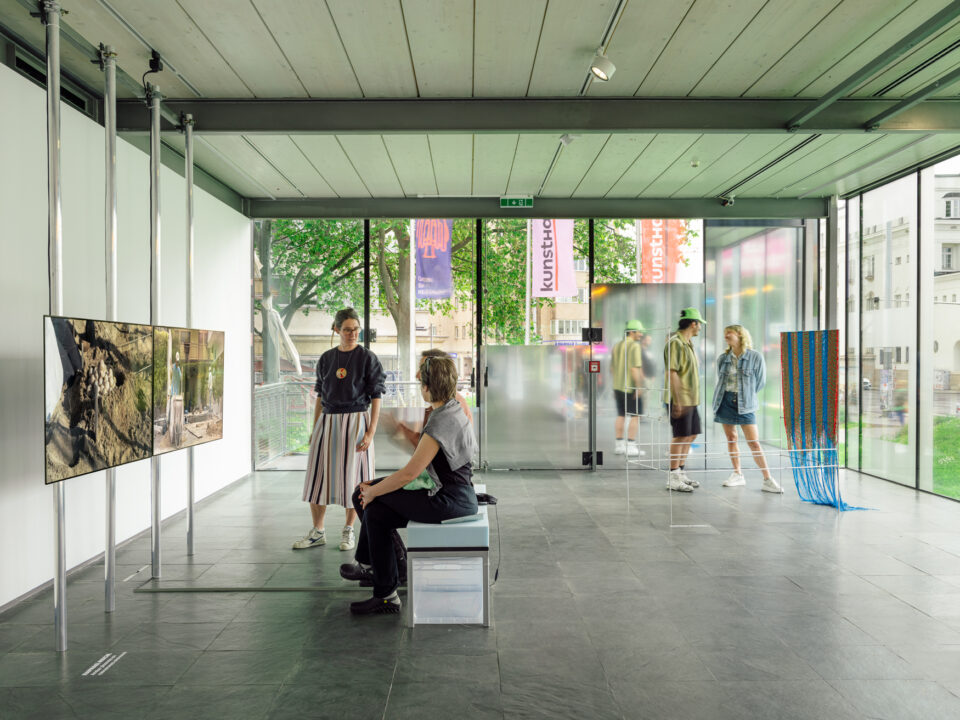 Unfreezing the Scene. Kunsthalle Wien Prize 2022 envisions the Karlsplatz site as a speakers’ corner where the artists can address issues that are of concern to them. Issues that extend beyond the confines of the art institution. Following this idea, the artists decided to unfold their practices, to duplicate, to mirror. This is embodied physically in the exhibition design within, but also moves in and out of the exhibition to other surprising places, so that the building loses its hard borders, melts, spreads out, and leaks into the city.