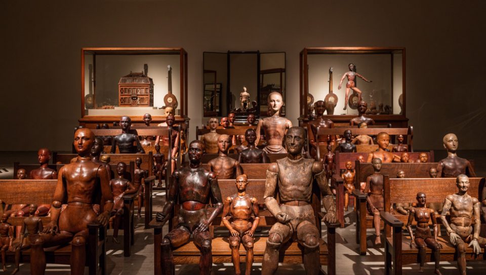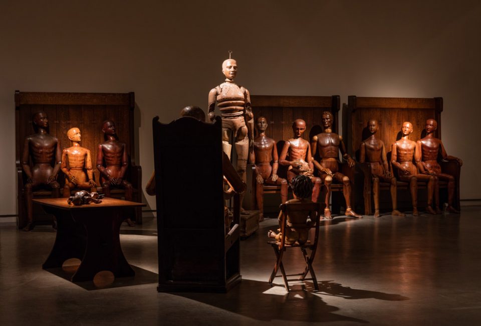 Spread across both halls of Kunsthalle Wien at its Museumsquartier location, the exhibition draws on several of the artist’s main areas of work from the past decade, showcasing them in the form of a multi-layered narrative. The central work, Death to Pigs, is a multi-part installation that discusses stigmatization and escalating violence on a metaphorical level. The title references the infamous Manson Family murders of the summer of 1969, when the killers tagged their crime scenes with the words “Death to Pigs.” From her wooden sleep… is the title of another spatial installation: an arrangement of roughly 150 life-size vintage, wooden, dolls.