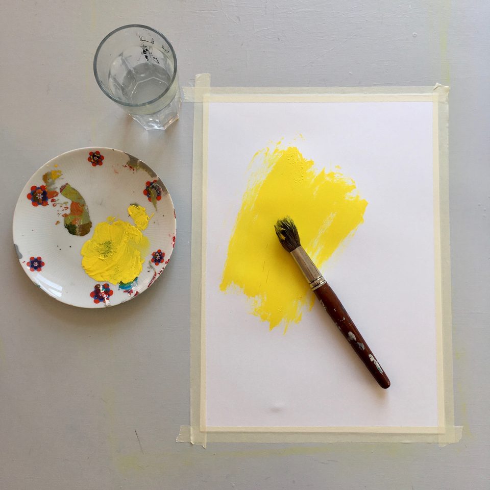 • Take a thick brush and prime the paper with paint.