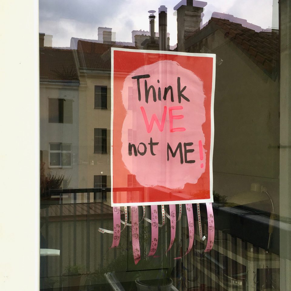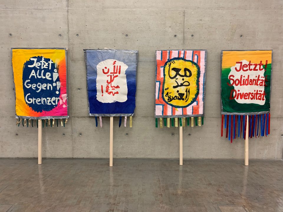 In our exhibition … of bread, wine, cars, security and peace you can see various posters designed by Marina and the New Neighborhood // Moabit community. Together they compiled messages that were important to them and captured their dreams and ideas on posters. Then they took these posters to a demonstration in Berlin and sent their messages out into the world.