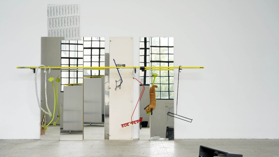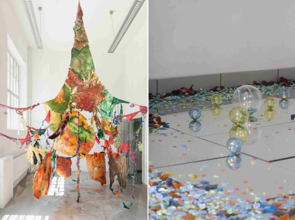 Anne Schmidt’s protean œuvre culminates in her thesis installation Strahlte. Geschöpf. Champagner. zottig. Klumpen [Radiated. Creature. Champagne. ragged. Lump], which stars giant ice-cream-cone sculptures, a chainsawed “procrastination pig,” the autofictional novel Me after Two Anal Orgasms, and tennis balls as well as the artist herself. Schmidt’s precise and vigorous engagement with normative images of desire in capitalist consumer society and probing creative scrutiny of institutional logics reflects her background as both an activist and a scholar of culture.