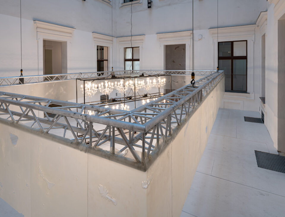 Conceived for atrium B of the Ferstel wing of the University of Applied Arts, Valentin Hämmerle’s site-specific installation LIGHT YELLOW GAZE 9201-104 *** presents a compelling combination of acute awareness of the principles of stage design and evident pleasure in transgressing them and opening the practice up toward other art forms. Critical reflection on the basic tenets of his discipline leads Hämmerle to turn to other forms and languages such as those of sculptural and installation design, but without losing his flair for space in relation to bodies in motion.