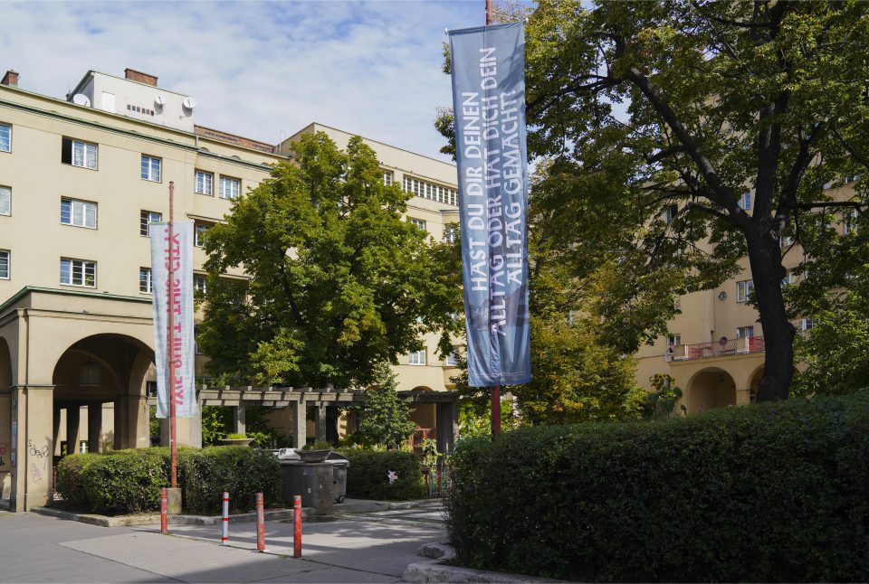 „Hast du dir deinen Alltag oder hat dich dein Alltag gemacht?“ / quote by Danger Dan from the song „Lauf davon“, produced and written by Danger Dan / released on March 5, 2021 / selected by Stefan Bayreuther, flag design by Paweł Sochacki, © Arts of the Working Class for Wohnpartner and Kunsthalle Wien, 2022