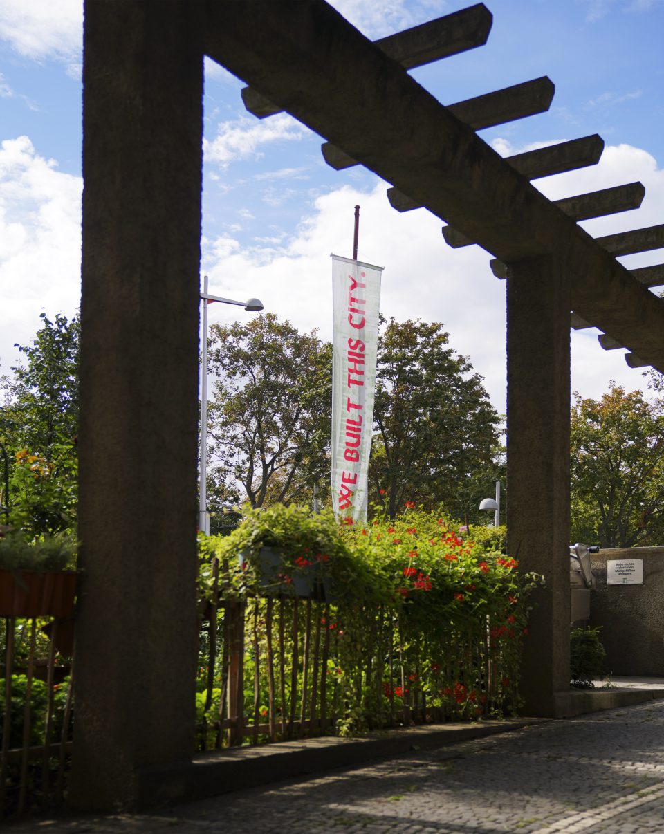 „We built this city.“ / quote by Starship from the song „We built this city“, produced by Peter Wolf, Jeremy Smith, Grunt Records/RCA Records, written by Bernie Taupin, Martin Page, Dennis Lambert and Peter Wolf / released on August 1, 1985 as part of the album Knee Deep in Hoopla / selected by Markus Hirnsperger, flag design by Paweł Sochacki, © Arts of the Working Class for Wohnpartner and Kunsthalle Wien, 2022
