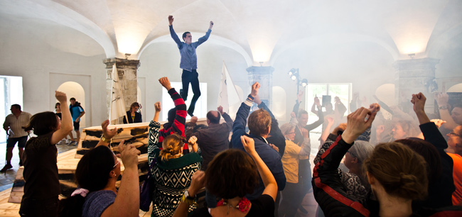 Für Christian Falsnaes ist das Publikum das Rohmaterial seiner Performances. Er fordert es auf, seinen Anweisungen zu folgen und schafft darüber absurde, aber auch herausfordernde Situationen. Die Performance jedes Einzelnen, aber auch gesellschaftliche Normen, Machtverhältnisse und Geschlechterrollen werden thematisiert. Wie in einem sozialen Experiment manipuliert der Künstler das Kollektiv, dessen Gehorsam er einfordert. Indem er die Bereitwilligkeit des Publikums zur Partizipation bis zum Äußersten strapaziert, entstehen Szenarien zwischen absurder Situationskomik, hingebungsvollem Körpereinsatz und fragwürdigem Autoritätsgestus.