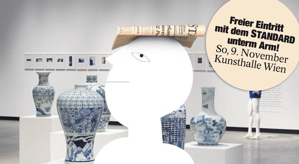 Wer freien Eintritt zur Ausstellung erhalten will, muss zwar nicht blau gekleidet sein, muss aber einen STANDARD unter dem Arm tragen.