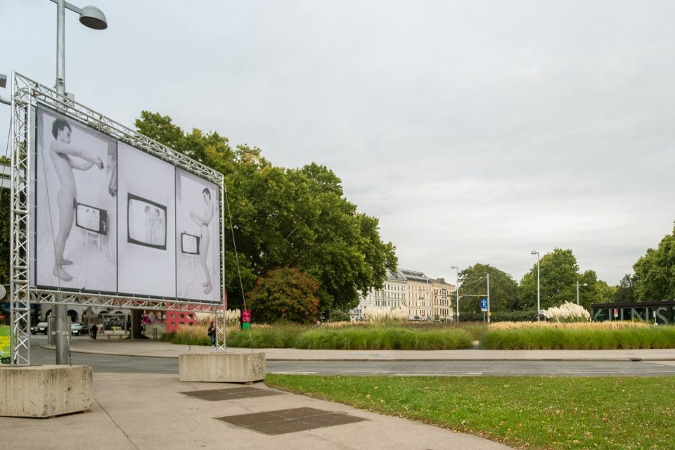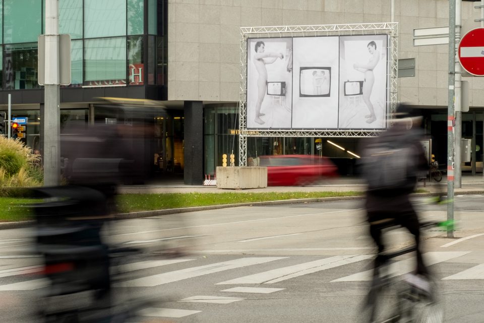 Für KISS werden drei Bilder aus einer fünfteiligen Serie mit Jörg Matzner und Barbara Binder vergrößert und im Wiener Stadtraum ausgestellt. Die drei Zellen zeigen drei Momente der Interaktion zwischen zwei nackten Körpern und einem technischen Gerät (einem Fernseher) innerhalb des Repräsentationsapparates des Studios. Das Bild in der Mitte zeigt das Abbild einer physischen Begegnung, genauer gesagt: eine Umarmung der beiden Akteur*innen, die auf dem Bildschirm des Fernsehers dargestellt ist. Dagegen zeigen die Bilder auf der linken und rechten Seite dieselben Personen, die hier jeweils für sich die gleiche Umarmungsgeste vollziehen – und damit lediglich die Luft umarmen.